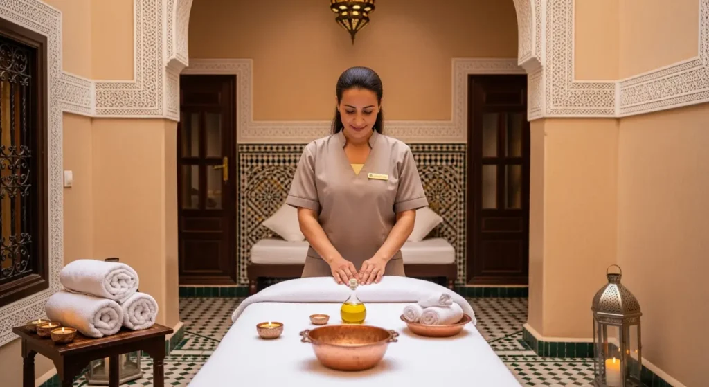 - Formation Continue : Nos thérapeutes sont formés aux rituels de luxe et à l’utilisation des produits de haute cosmétique marocaine.