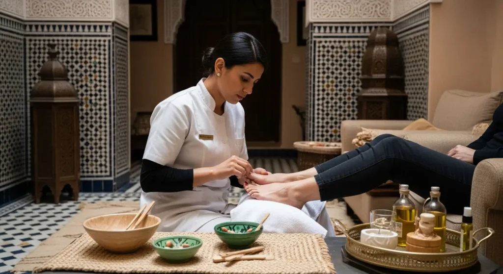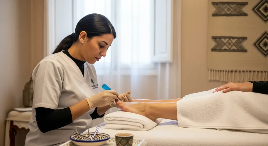 Nous travaillons avec les leaders mondiaux comme OPI pour les vernis classiques et les gammes professionnelles pour le Semi-Permanent. Nous garantissons une brillance éclatante et une tenue longue durée, idéale pour vos vacances ou vos événements à Marrakech. - Le Soin « Spa » des Mains et Pieds :